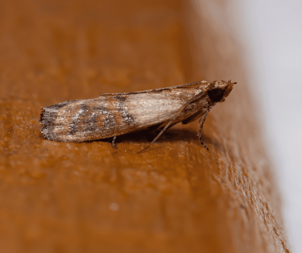 This moth is another pantry pest that targets flour, grains, and baking supplies. It can build up quickly in cupboards and storage areas. You may notice webbing in food containers or moths near pantry shelves. Even “sealed” packages can sometimes be affected once opened. A full pantry reset and control plan is often needed.